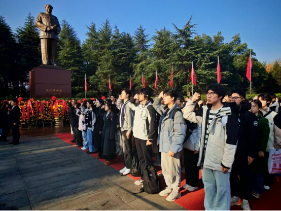师生首站抵达毛泽东同志铜像纪念广场,韶山党性教育基地讲解员罗娟为全体师生讲述了毛泽东同志从韶山冲走出、一步步领导中国革命迈向胜利的光辉事迹。随后,全体师生向毛主席铜像敬献花篮,鞠躬致敬,这既是对伟人的深切缅怀,更是对中国共产党人初心使命的传承和坚守。面对鲜红的党旗,预备党员们进行入党宣誓,铿锵誓言回荡在广场上空。在毛泽东同志遗物纪念馆内,从打满补丁的衣物到泛黄的手稿,从简朴的生活用品到数不清的书籍,一件件遗物、一个个故事,生动诠释着毛泽东同志“为人民服务”的赤子情怀,反映出一代伟人崇高的精神和人格风范。