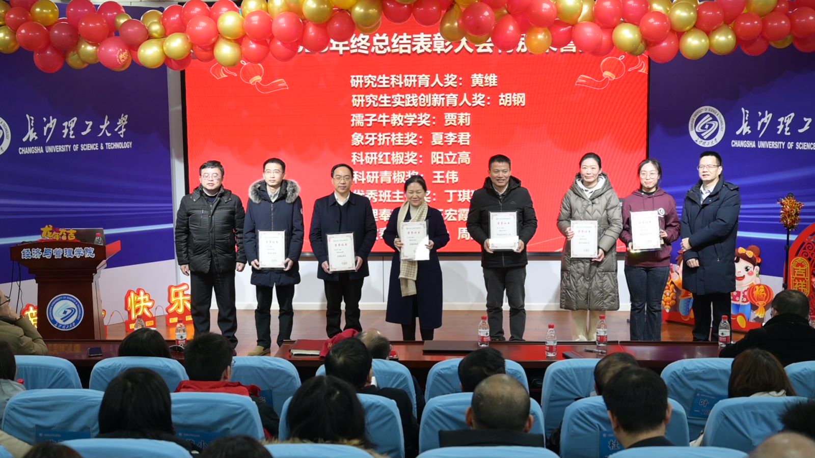 大会举行了年度特别荣誉奖的颁奖仪式,用于表彰一年来在本科教学、科研、研究生教育、学生工作和行政管理等方面做出突出贡献的优秀老师。“研究生科研育人奖”黄维、“研究生实践创新育人奖”胡钢、“孺子牛教学奖”贾莉、“象牙折桂奖”夏李君、“科研红椒奖”阳立高、“科研青椒奖”王伟、“优秀班主任奖”丁琪琳、“管理奉献奖”王宏霞、“思政奉献担当奖”周路路老师当选。
