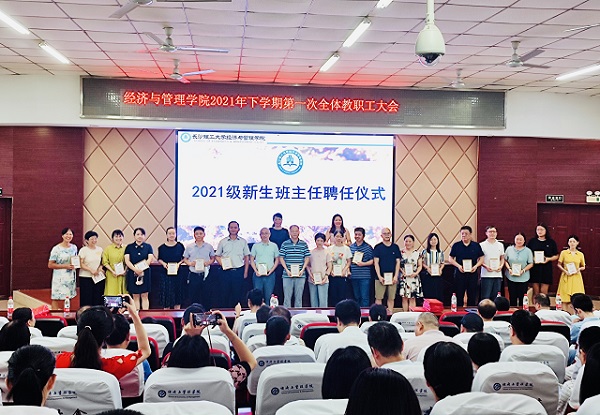 大会伊始,学院为新入职老师举行了欢迎仪式,丁丹代表学院热烈欢迎两位新老师加入经管大家庭,并为他们佩戴校徽,赠送“新人礼包”,勉励新人“不忘教书育人初心,牢记立德树人使命”。接着,2021级新生班主任们上台集体亮相,学院为她们颁发了“永久牌”聘书,感谢她们选择班主任这个光荣的岗位,祝福他们与新生共同启航,开启长理新篇章。同时,受到学校表彰为“优秀教师”、“优秀教育工作者”的老师们也走上台前,院领导为他们颁发证书,并希望全体教职工学习他们身上优秀的品质,为长理的发展贡献自己的力量。