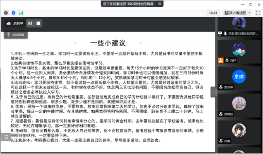 活动中,考上上海大学的梁峰同学从目标学校选择、专业课和公共课复习、时间分配与管理等角度就自身备战心得做了详细解读,并向同学们分享了自己考研时所用的一些文字、视频资料、公众号及使用建议,为大三同学考研备考提供了大量实用信息。