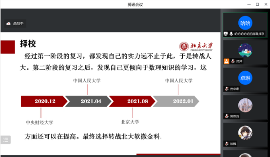 考上北京大学的张梁同学从考研择校、信息获取、时间安排等方面分享自己的经验与感受。他强调信息获取与资料搜集非常重要,备考过程需做到劳逸结合,合理安排时间,为同学们备考及学习提供了引导帮助。