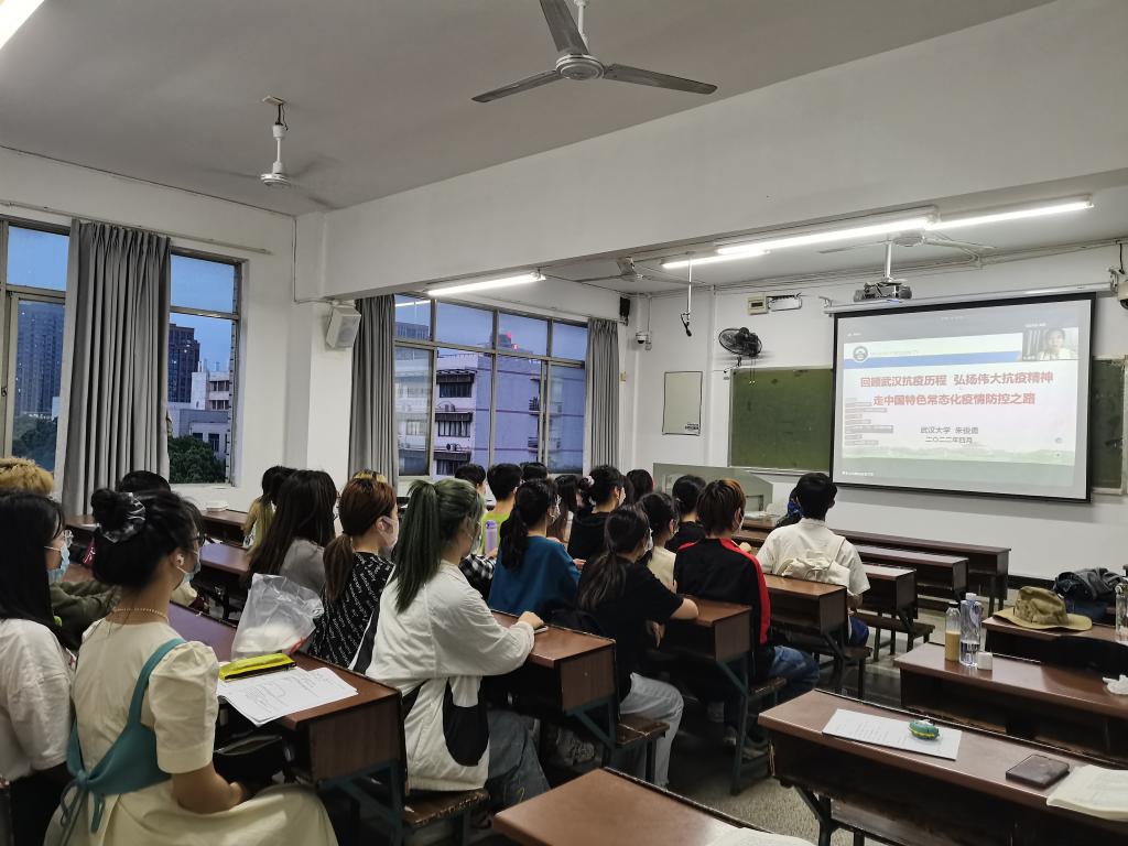 在这堂意义非凡的爱国主义教育思政课程中,朱俊勇通过一个个生动的故事深情并茂地讲述了自己以及他的夫人、他的学生参与武汉疫情保卫战以及支援其它省份抗疫的感人故事,表达了对于疫情一线工作人员的感激以及身为参与者的骄傲,介绍了第二战场的幕后抗疫者——社区干部、志愿者、党员突击队等为抗“疫”做出的贡献,解读了疫情防控取得阶段性成果的三条原因和四个阶段。并结合新冠病毒变异下的特点用科学理论解读了“动态清零”政策的科学原因,号召大家要坚定信念,遵守抗疫规则,坚持走中国特色常态化疫情防控之路。