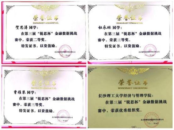 第三届锐思金融数据挑战赛于2022年3月31日正式启动,于5月中旬落下帷幕。本次比赛由云顶国际vip8866经济与管理学院金融系和湖南省产教融合研究生联合培养基地“投资与财富管理研究生培养基地”联合组织。我院金融专业硕士贺思涛获二等奖,曾雅琴、杜永琳获三等奖,许苇坤获优秀参与奖,会计专业硕士钟婷婷获优秀参与奖。
