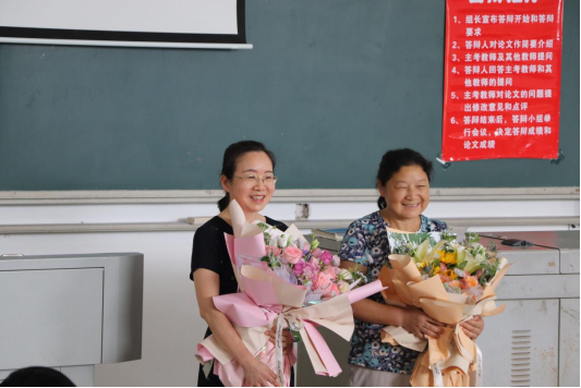 6月9日上午11点,在综合教学楼B202教室2022届会计专业本科毕业生论文答辩现场,在文科楼A208教室第四节课课后,经管学院为今年即将退休的冯丽霞、刘建英、蒋芝花三位老师举行了2场特别的荣退仪式。学院领导、财会系所有老师、部分学生代表等共同见证了这场特殊的仪式。院工会主席何昊主持了仪式,介绍了三位老师的相关情况,财会系系主任张鼎祖、支部书记刘天雄代表系里送上感恩与祝福,学生代表纷纷上台表达对恩师的感谢之情,三位老师也激动地分享了从教38年来与学校学院共成长、共发展的职场历程与此刻的复杂心情。学院党委书记丁丹、副院长彭新宇代表学院为三位老师送上礼物和真挚的感谢。所有在场的师生一起向三位老师鞠躬并送上最真诚的祝福“老师您辛苦了,退休快乐!”