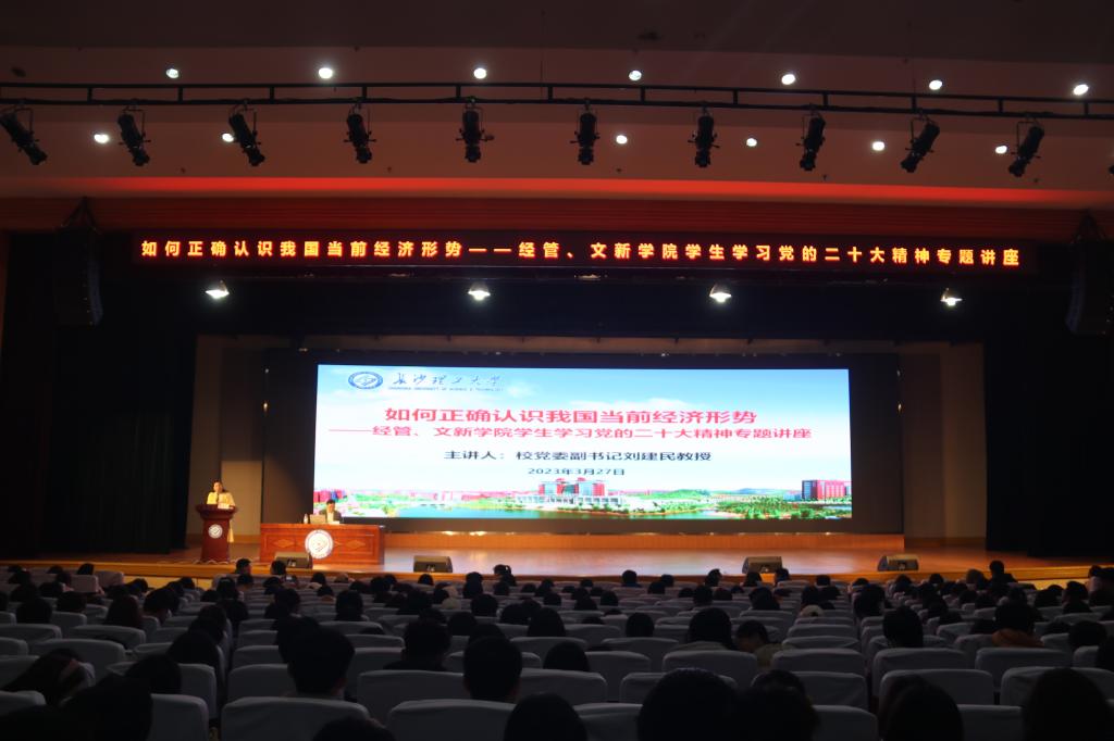 3月27日晚7点,经管、文新学院一千余名师生齐聚五教大礼堂,共同聆听校党委副书记刘建民教授以“如何正确认识我国当前经济形势”为主题的学习党的二十大精神专题讲座,讲座由院党委书记丁丹主持,经管、文新学院相关党政领导、年级辅导员参与讲座。
