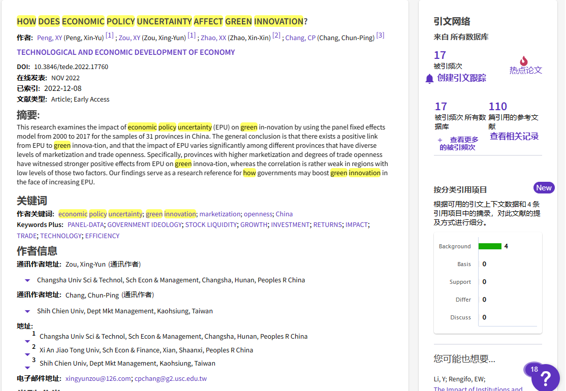 根据ESI(Essential Science Indicators)的最新数据显示,我院博士生邹幸芸为第二作者(第一通讯),导师彭新宇教授为第一作者,合作者西安交通大学赵欣欣署名第三,我院特聘教授张存炳教授署名指导的科研论文《HOW DOES ECONOMIC POLICY UNCERTAINTY AFFECT GREEN INNOVATION?》入选ESI高热点论文(此热点论文在2023 January/February期间,其被引频次已进入Economics & Business学术领域最优秀的0.1%之列)。该论文于2022年11月发表在《TECHNOLOGICAL AND ECONOMIC DEVELOPMENT OF ECONOMY》期刊,该刊当前影响因子为5.656,JCR分区为1区。