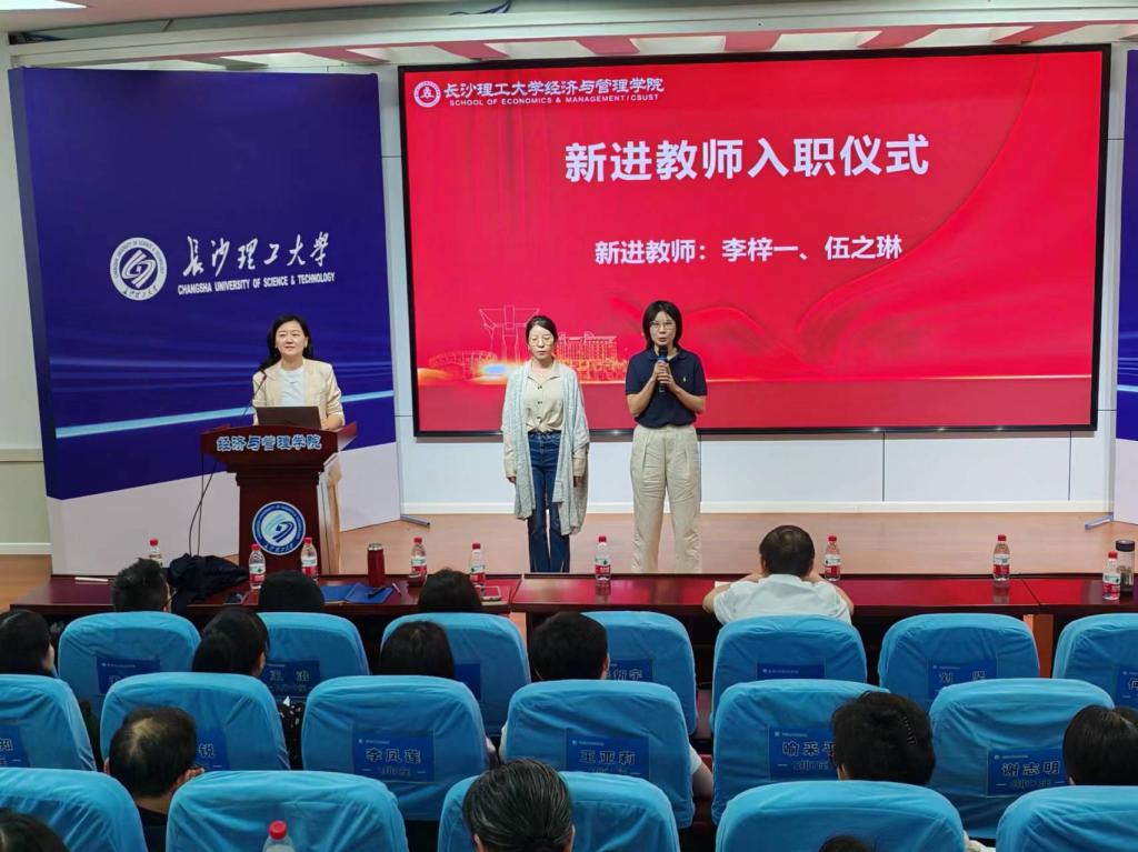 随后举行了新教师入职仪式,今年以来新入职的两位教师李梓一、伍之琳先后从个人基本情况、研究方向等方面做了自我介绍,表示作为一名新经管人,将传承学院优良传统,尽快融入学院,熟悉工作,为学院事业发展和人才培养贡献力量。彭新宇代表学院为她们佩戴校徽并送上了入职纪念品。