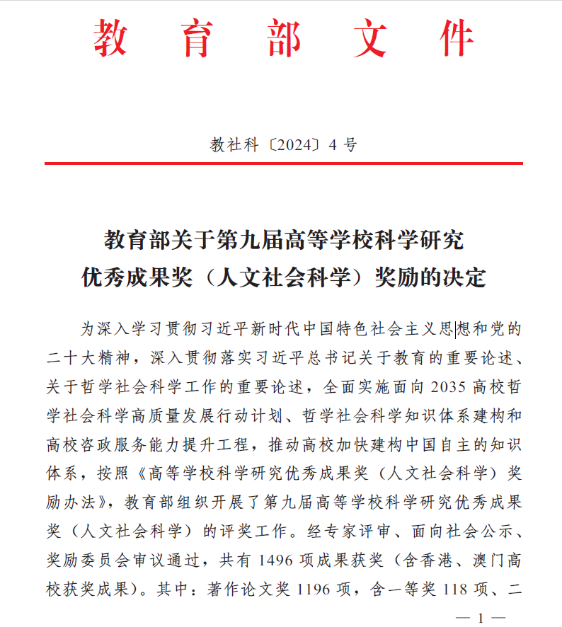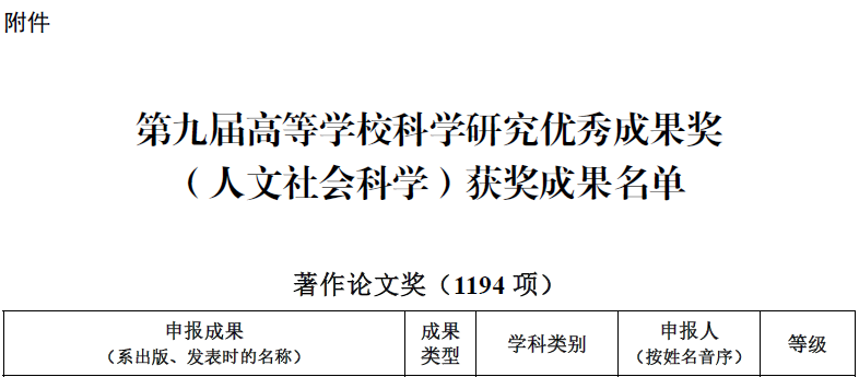 高等学校科学研究优秀成果奖(人文社会科学)始设于1995年,是教育部为表彰全国高校人文社会科学工作者所取得的突出成绩而设立的奖项,每三年评选一次,是目前国内人文社科领域最具公信力和影响力的重要奖项。第九届高等学校科学研究优秀成果奖(人文社会科学)获奖成果共有 1496 项成果获奖 (含香港、澳门高校获奖成果)。其中:著作论文奖 1196项,含一等奖118项、二等奖 513项、三等奖565项;咨询服务报告奖76项;普及读物奖21项;青年成果奖203项。我院教师此次获奖,是云顶国际vip8866在人文社科领域科研成果的重大突破,将推动学校人文社会科学学科建设迈上新台阶。