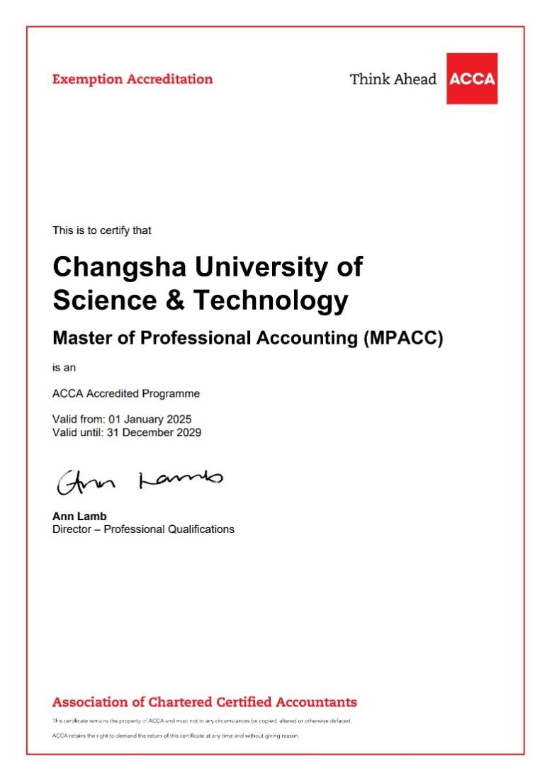 近日,云顶国际vip8866会计硕士专业学位(MPAcc)项目通过了特许公认会计师公会(ACCA)总部的免试审核,成为湖南第二所获得此项认证的高校。在2025年1月1日至2029年12月31日期间云顶国际vip8866会计硕士专业学位(MPAcc)项目的毕业生,在获得硕士学位后,将享有免考特许公认会计师公会(ACCA)认证的九门课程的资格。