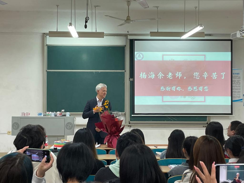 杨海余老师对学院准备的“惊喜”表达了感谢,他动情回忆了近四十年来的教学与工作生涯,表达了对长理的感恩之情,对学生们的祝福之意。杨教授表示退休后也会继续关心关注学院和同学们的发展,愿意尽自己所能用另一种方式继续发光发热。