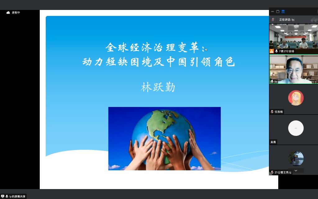 2022年6月2日下午,中国社会科学院大学林跃勤教授为我院师生做了题为“全球经济治理变革:动力短缺困境及中国引领角色”的讲座。讲座采取线上及线下相结合的方式进行,学院部分老师和研究生共计100余人聆听了报告。此次讲座由副院长彭新宇教授主持。