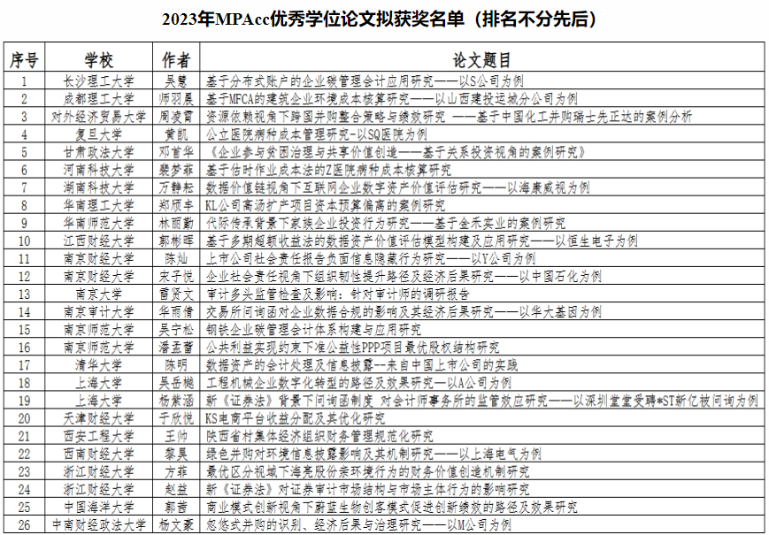 近日,全国会计专业学位研究生教育指导委员会经形式审查、匿名通讯评审、会议集中评审和会计教指委全体会议审议通过,公布了2023年全国MPAcc优秀学位论文评选结果,26篇学位论文被评为全国优秀学位论文。云顶国际vip8866经济与管理学院邓学衷教授指导的2023届会计专业硕士吴慧同学的学位论文《基于分布式账户的企业碳管理会计应用研究—以S公司为例》荣获2023年全国MPAcc优秀学位论文奖。这是云顶国际vip8866在全国专业硕士优秀学位论文第二次获奖。