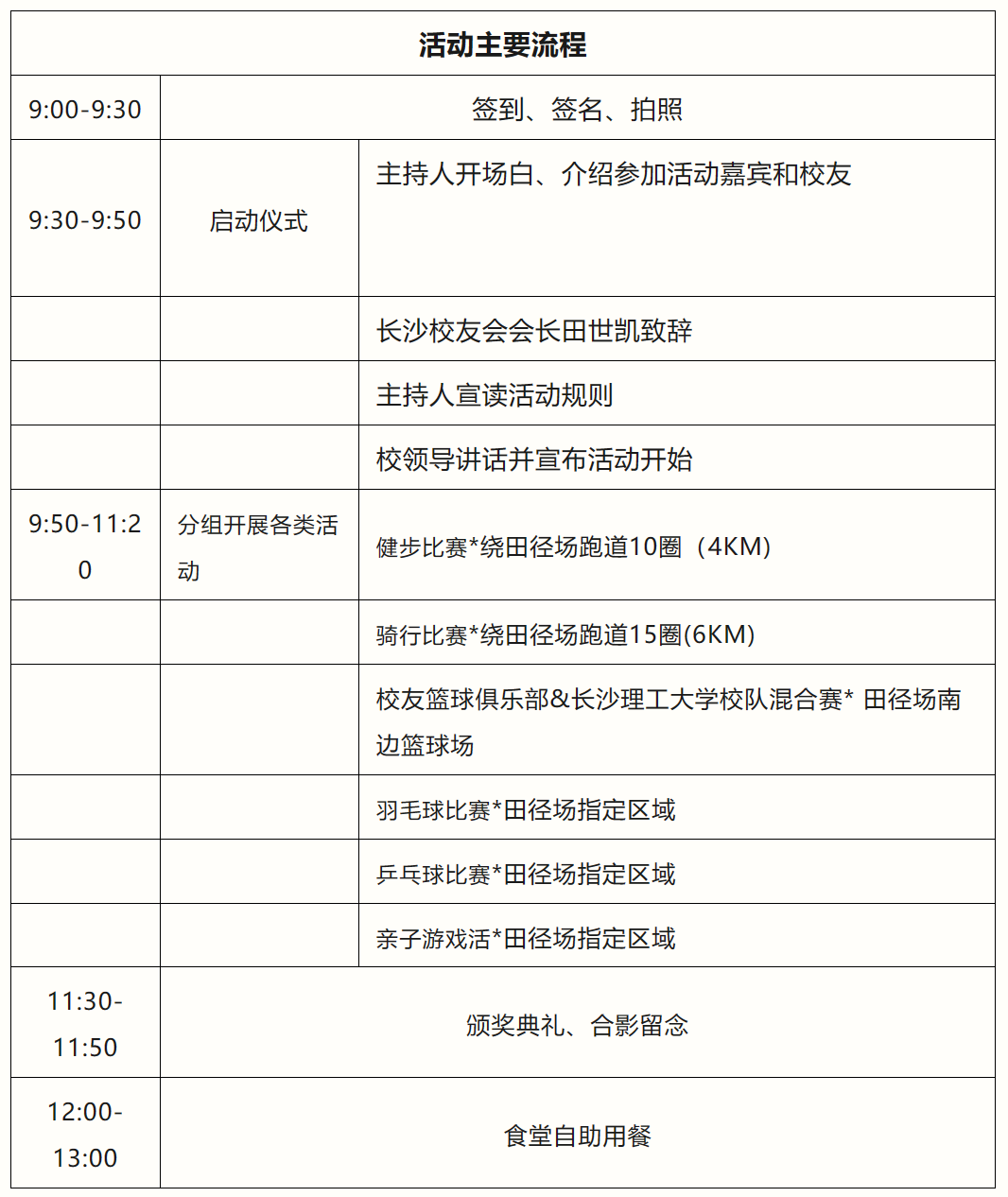 健步行活动(校内)由长沙校友会具体组织实施,于2023年5月20日上午9:00在云顶国际vip8866金盆岭校区田径场开始签到,随后开展健步行等体育娱乐活动。参与者可选择骑自行车、健步行、篮球、羽毛球、乒乓球、亲子游戏等活动。场地安排为: