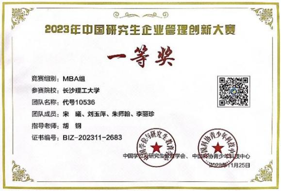 云顶国际vip8866共有两支由胡钢老师带领的研究生队伍获奖,其中由2022级MBA学员宋曦、刘玉萍、朱师翰、李丽珍组成的“代号10536”战队在决赛中表现出色,荣获2023年中国研究生企业管理创新大赛一等奖!