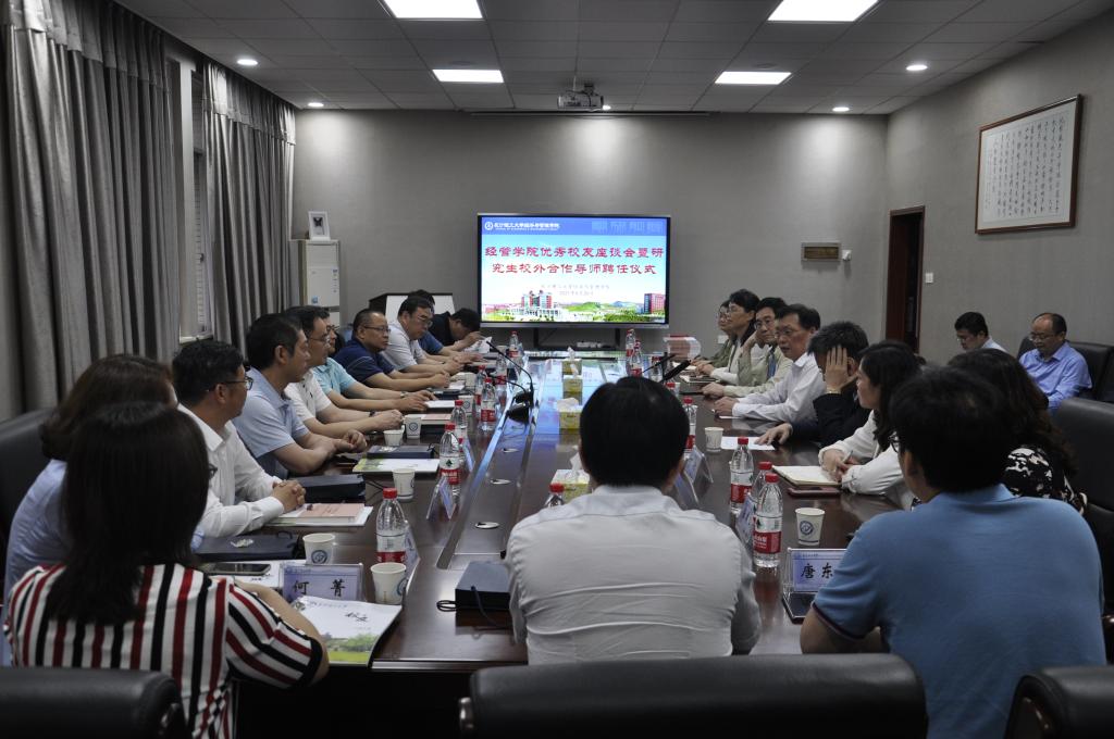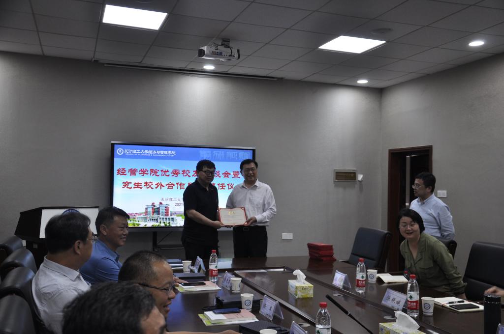 副校长谈传生为13位校友颁发了研究生校外合作导师聘书。校友们与学校领导老师就校企合作、企业案例资源共享、创新人才培养等方面进行了深度交流,大家表示将以担任导师为契机,充分发挥对母校人才培养工作的实践指导作用。校友代表唐定乾代表广大校友表达了对母校的感恩与对老师的感激之情,他表示一定发挥团队合力,抓好落实,为学校的发展建设贡献校友力量。
