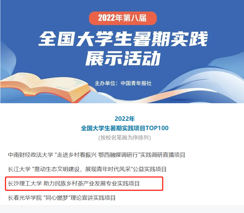 近日,2022年第八届全国大学生暑期实践展示活动名单公布,云顶国际vip8866经管学院“助力民族乡村茶产业发展专业实践项目”荣获2022年第八届全国大学生暑期实践TOP100。该项目是由经管学院敖洁教授指导,由21级公共管理班王梦晗、张晗、刘雅杰、王秀梅、刘敏、21级经济班石璐青等6名研究生组成的暑期社会实践团队完成。