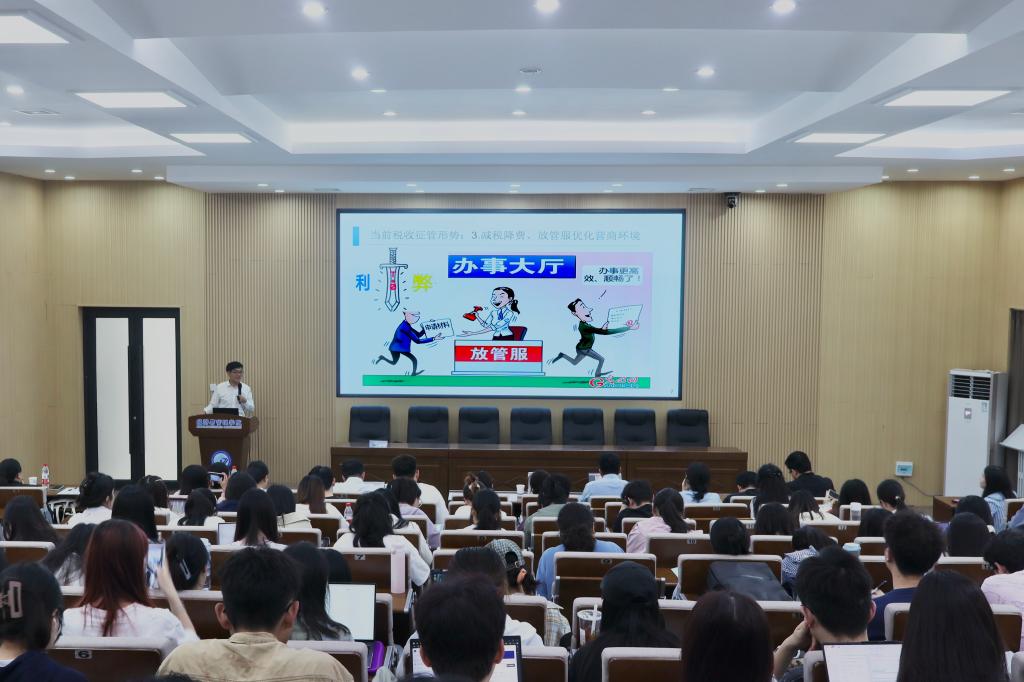 2025年4月26日下午,国网浙江省电力公司正高级会计师、全国知名税务专家杨仁标应邀在经管大楼100报告厅主讲金岭学术大讲堂第57期(2025年第11期),主讲题目为:“当前税收征管形势及业财税协同”。副院长王治主持,学院师生共100余人参加了本次讲座。