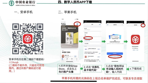 (2)扫描对应手机型号二维码下载数字人民币APP,输入手机号码注册——绑定银行卡——将ID号和姓名发给农行。
