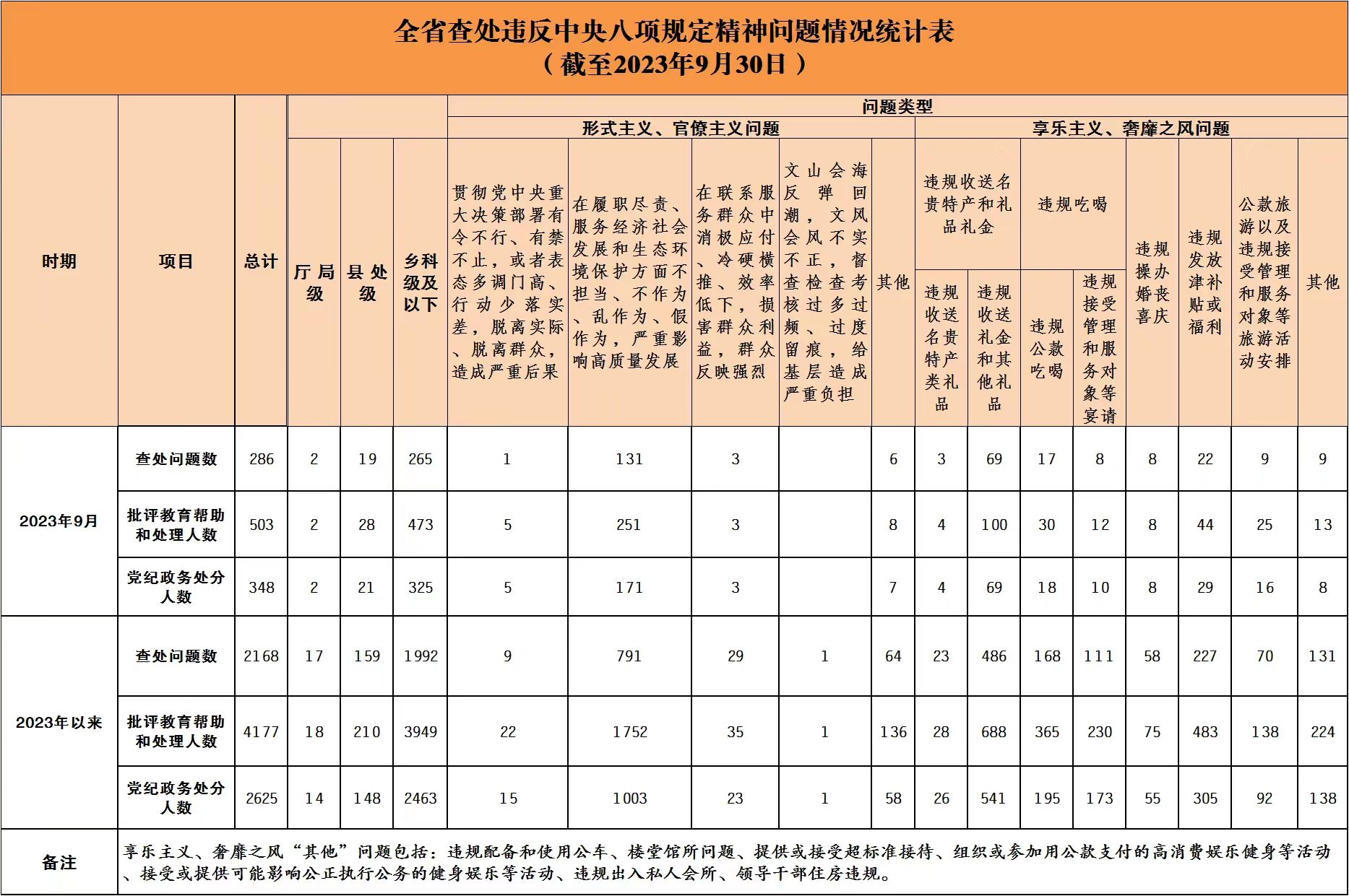 湖南省纪委监委深入贯彻中央纪委国家监委工作部署,在全省各地各部门各单位建立了落实中央八项规定精神情况月报制度。2023年以来,截至9月30日,全省查处违反中央八项规定精神问题情况如下: