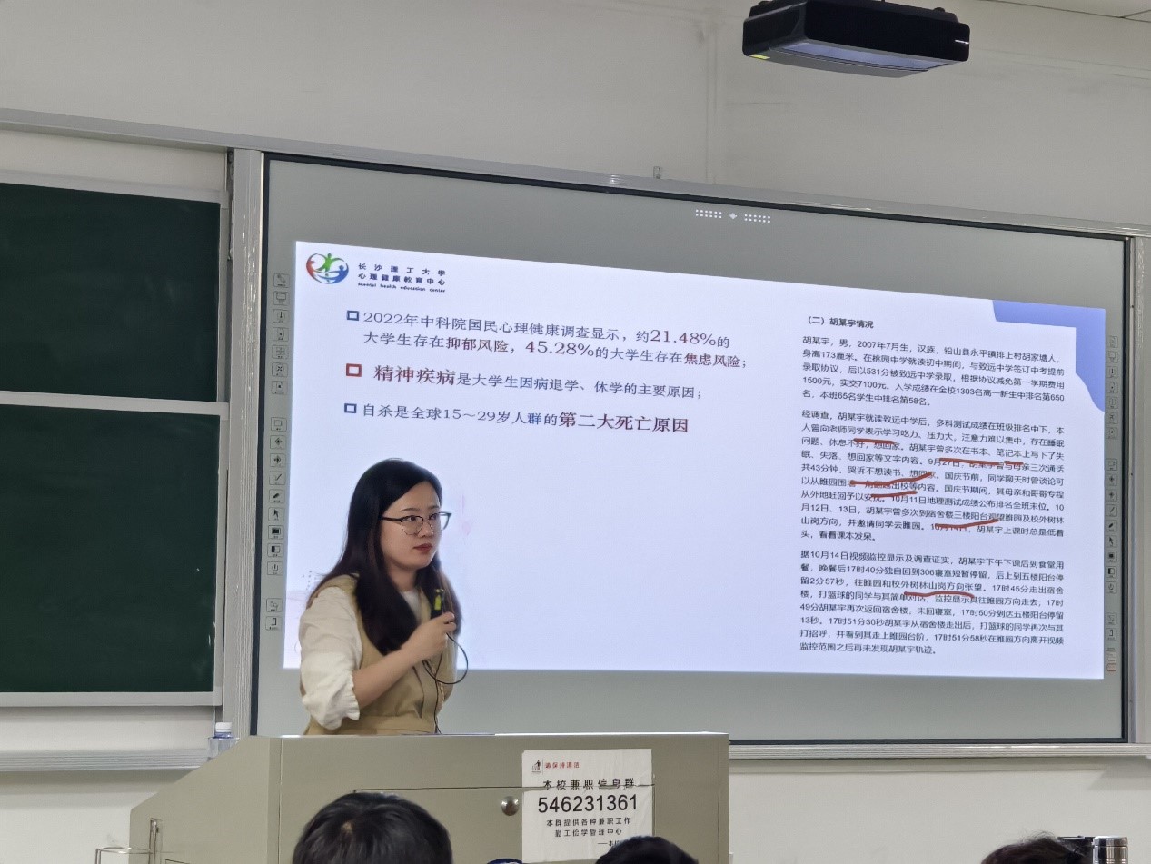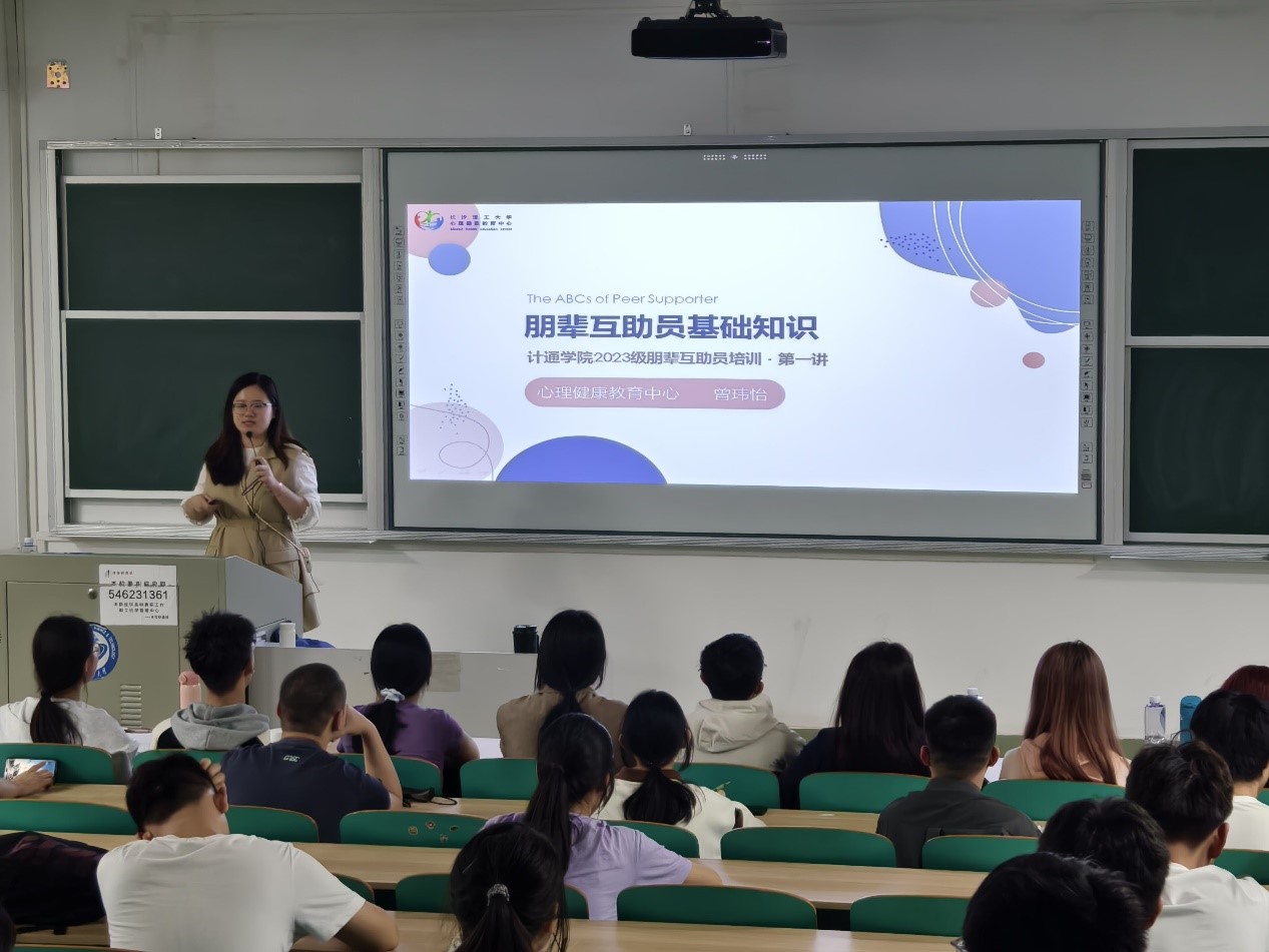为提高朋辈心理互助能力,加强学生心理素质,培养学生健全人格,4月17日晚,计通学院在金盆岭6-312教室举行了2023级朋辈心理互助员上岗培训班开班仪式,云顶国际vip8866心理健康教育中心曾玮怡担任第一讲面授教师,23级辅导员刘洋主持,23级全体心理委员、寝室长、学生骨干参加。