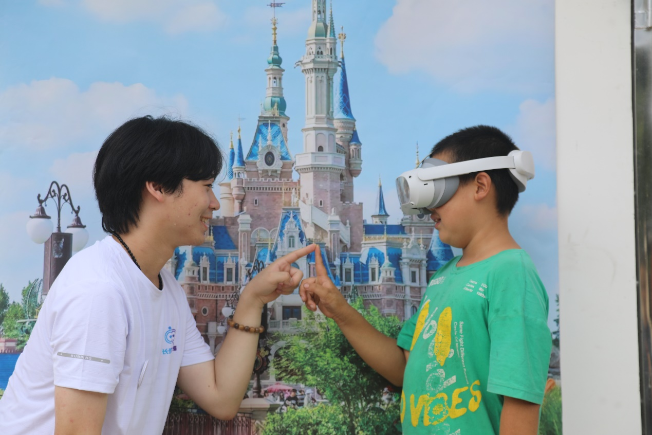 团队在村委办公室设置了VR体验室,志愿者首先向孩子们介绍了VR眼镜的基本原理和功能。通过VR眼镜的场景复现,让孩子们置身于游乐园等地。同时,志愿者们通过VR技术的交互性,将网络诈骗情景复现于小朋友面前,将网络安全知识带入现实。