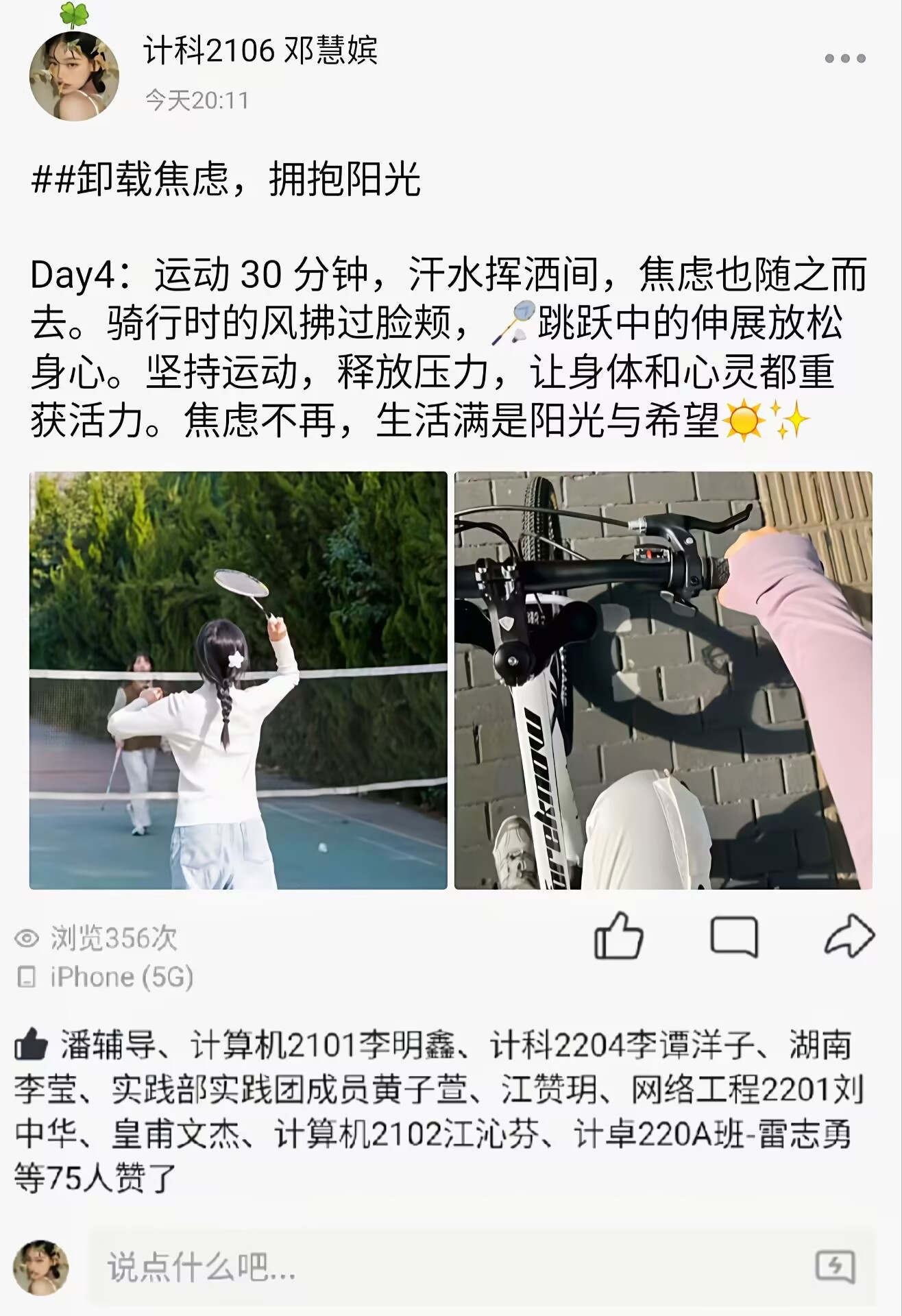 在快节奏的现代生活中,焦虑已成为影响大学生心理健康的重要因素之一。为响应学校“世界精神卫生周”活动的号召,学院举办“卸载焦虑”七天打卡活动,旨在通过一系列实践活动,帮助学生正确认识焦虑,学习有效的应对策略,以积极的心态和行动摆脱焦虑困扰,促进身心健康发展。