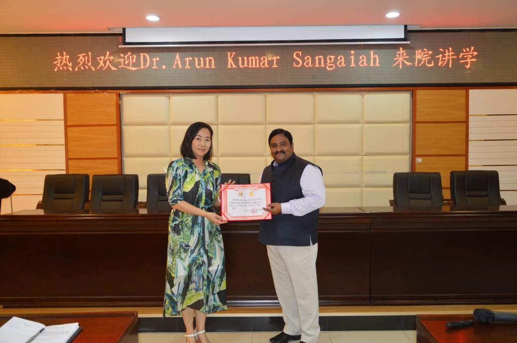 报告会后,Arun Kumar Sangaiah教授受聘为我院客座教授,并由学院党委方琼书记颁发了证书,学院特聘副院长王进教授出席受聘仪式。