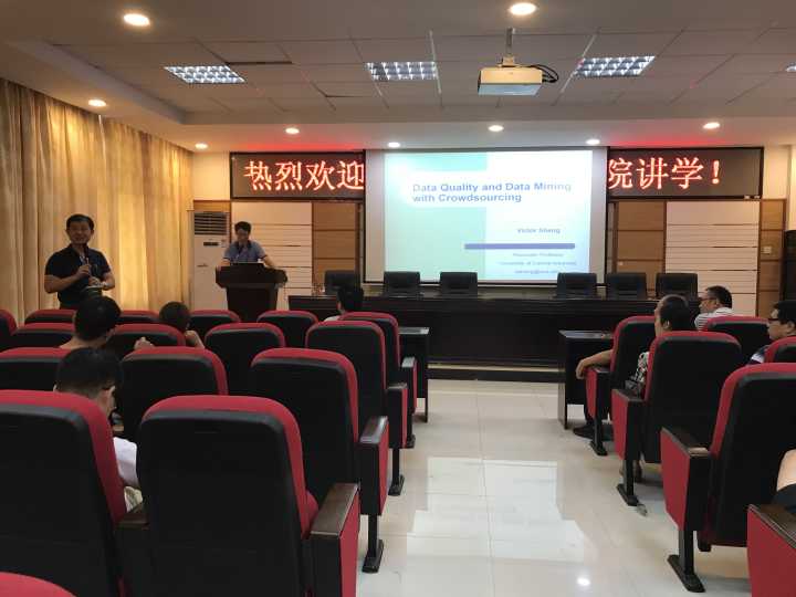 本次讲座主题是“Data Quality and Data Mining with Crowdsourcing”,即“数据质量和数据挖掘与众包”,盛胜利教授首先介绍了自己的研究领域为数据挖掘与机器学习、人工智能、数据安全和决策支持,及其在商业、生物信息学、医疗信息学、软件工程等领域。紧接着,盛教授从日常生活入手让大家了解众包的几个因素,随后列举了京东、微信等平台的众包,来阐述众包数据收集的特点。盛教授抛出了如何有效收集数据信息、如何有效利用数据信息两个问题,并着重围绕这两个问题进行了讲解。报告会中,盛教授层层递进讲解众包应用中的实际问题,使大家更全面多维地理解众包。