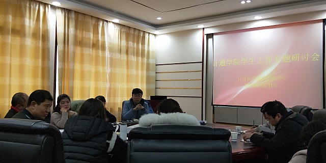为提升学生工作水平,研讨学生工作新思路,计通学院于1月11日下午召开了学生工作专题研讨会。研讨会特地邀请学院副院长姜腊林、副院长夏卓群、院长助理何施茗、教务办主任李秋桂老师参加,会议由学院党委副书记陈华主持,全体辅导员参加会议,院长王进听取了汇报并就学院2019年的学生工作提出了指导性意见。