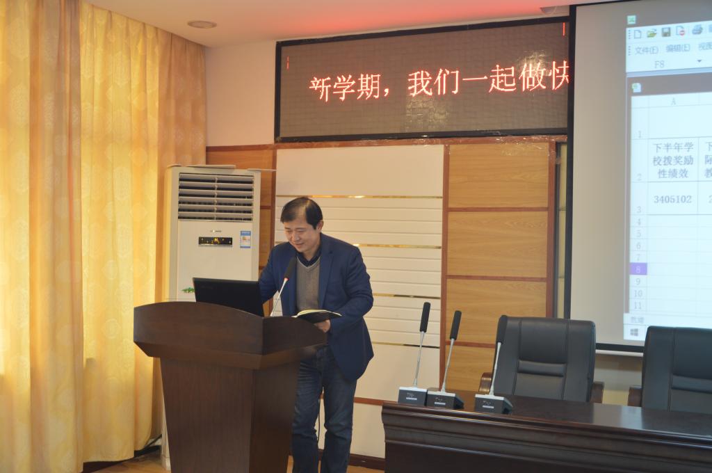 王进院长向全体教师做题为《新学期,我们一起做快乐的追梦人》工作报告。报告主要包含学院酬金分配解读、2018年我院取得的新成绩以及2019年我院工作要点三个方面。王院长首先向各位教师详细地解读了计算机与通信工程学院酬金分配制度,让每位教师对酬金分配政策一目了然。随后王院长结合《云顶国际vip88662019年工作计划》部署了2019年我院工作:一、教学方面。我院教师应积极响应学校号召,提高教学质量,打造精品课程;二、鼓励我院教师积极申报“湖湘学者”,发挥科研及创新精神,增加科研创新项目;三、做好我院软件工程博士点的申报及本科计算机专业工程认证,为计算机与通信学院画上隆重的一笔。之后王院长宣布我院新闻宣传工作荣获云顶国际vip88662018年新闻宣传工作先进集体、“十佳网站”,潘枝花老师荣获“先进个人”称号。