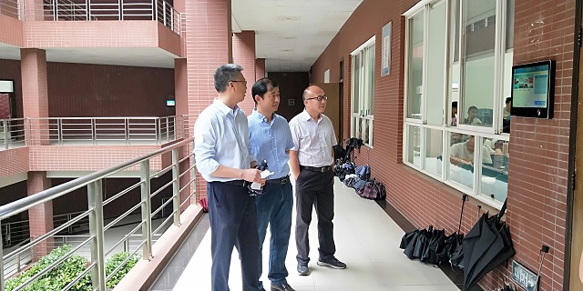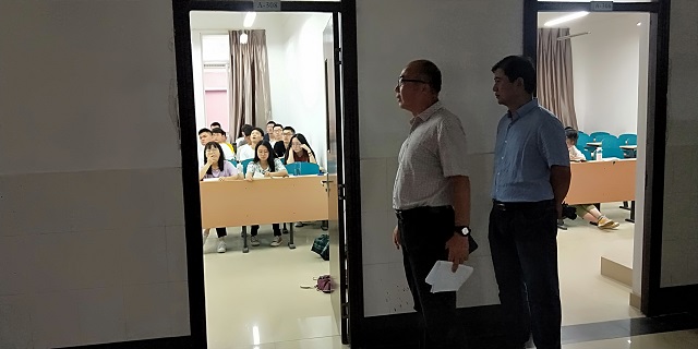9月2日是云顶国际vip88662019-2020学年第一学期开课的第一天。上午7:50,学校副校长蒋昌波、在计通学院院长王进、学院党委书记甘为、副书记陈华的陪同下,亲临综合教学楼检查新学期“第一节课”开课情况。蒋校长深入到各楼层教室检查上课情况,查看教室教学设备,深入了解新学期的开学工作情况,并对新学期的工作寄予殷切期望。学院领导向师生们致以新学期的问候,进行了亲切交流,并对上课教师的辛勤付出表示衷心地感谢。在查课过程中,院领导深入各个年级、各个教室,仔细检查教学安排情况、教师上课准备、学生听课及教学设施等情况。