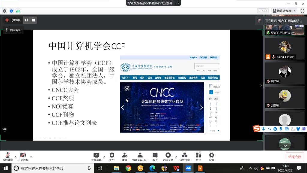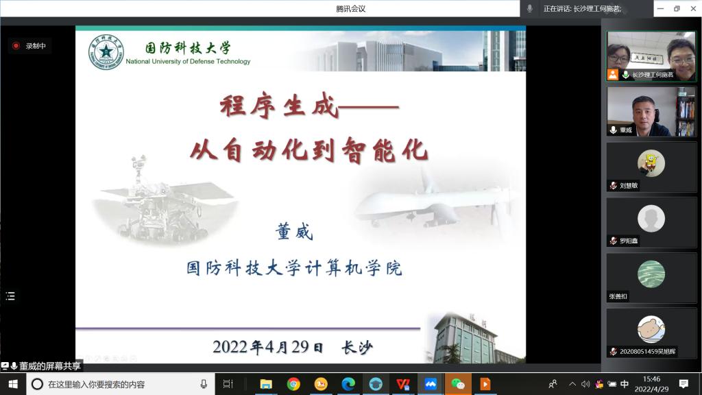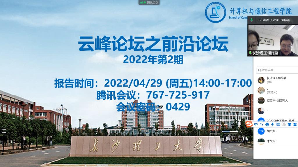 2022年4月29日下午,云顶国际vip8866计算机与通信工程学院“云峰”论坛之前沿论坛2022年第2期线上会议成功举行。本次会议邀请CCF专委会秘书长、国防科技大学计算机学院蔡志平教授、沈立教授、董威教授和赵宝康副教授分别做了“IPv6环境下的网络安全和智能测绘技术”、“全状态量子模拟器在CUP+GPU异构平台上的性能优化”、“程序生成——从自动化到智能化”和“6G时代的天地一体化网络技术”4场精彩的学术报告。同时4位老师也分别介绍了CCF理论计算机学科专委会、CCF体系结构专委会、CCF形式化方法专委会和CCF互联网专委会。报告会由云顶国际vip8866计算机与通信工程学院张锦院长和何施茗副院长共同主持。我院师生160余人积极参加了此次报告会。