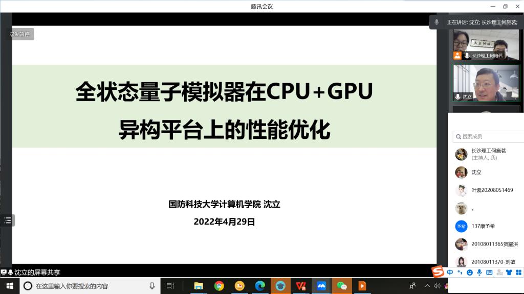 沈立教授以通用量子线路模拟器在CUP+GPU异构平台上的性能优化问题为切入点,并分析了全状态模拟器具有计算并行度高、数据局部性差、计算访存(或通信)比低等特点,因此很难充分利用GPU等加速器的性能优势。沈立教授介绍了其团队研究的DLC(Data Locality and Communication)优化框架,并详细讨论了该框架中全状态向量模拟器的数据访问规律。该框架通过数据划分提高了GPU端的数据局部性,利用动态数据布局减少了GPU之间的通信次数和通信数据量,大幅度提升了全状态量子模拟的性能,并大大减少了模拟所使用的GPU数量。
