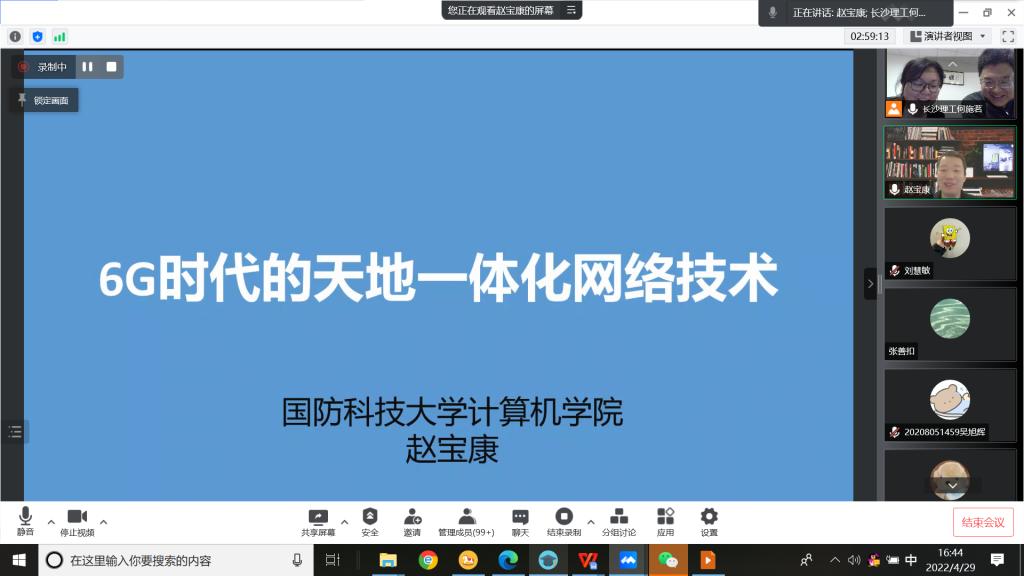赵宝康副教授以天地一体化网络系统为主题开展了相关网络体系结构、路由交换、传输优化、安全增强等核心关键技术的学术讲座,本次报告系统性地介绍了卫星互联网的概念、发展现状以及研究成果,并着重分析了典型的卫星互联网——星链。详细阐述了星链系统的组成、架构、特点以及其他相关的卫星互联网发展现状。随后,赵宝康副教授分别从架构、路由、传输以及安全等方面对该领域当前的研究进展与未来的发展方向做了简要的介绍,并于参与师生针对该领域相关科研工作的仿真实验以及软件工具等问题进行了深入的探讨和交流。