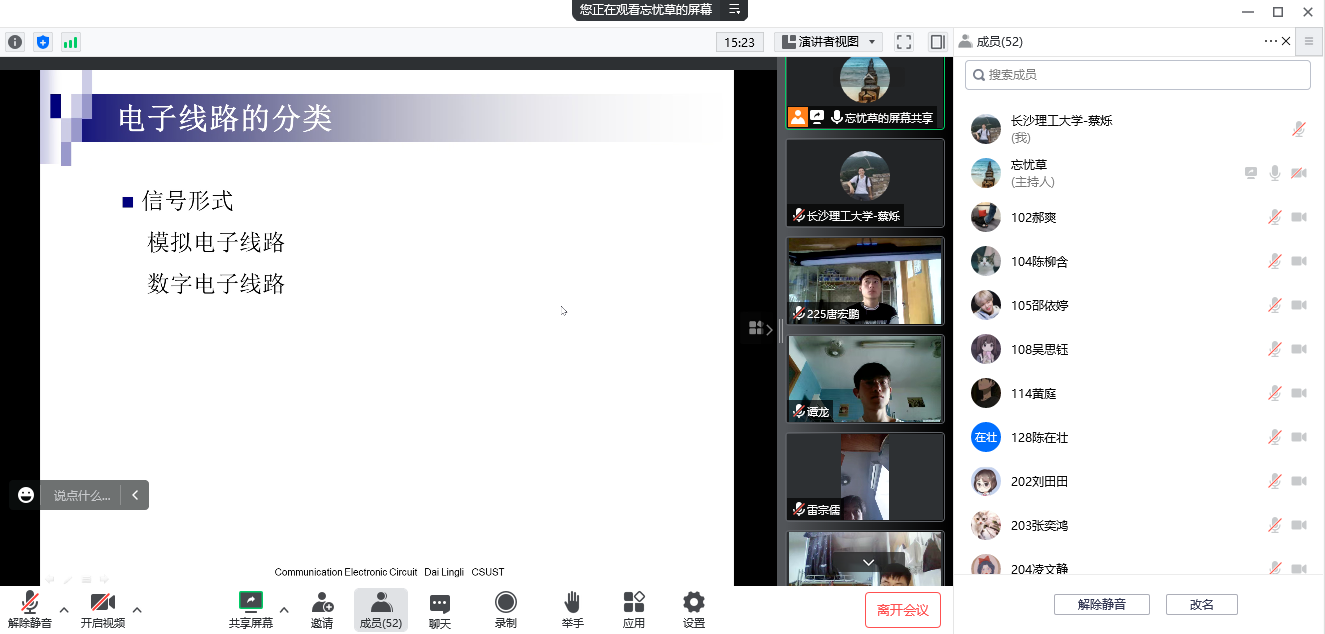 几位教师精神状态饱满,教学准备充分,授课中能合理把握教学节奏,条理清晰,较好地完成课程目标及任务规划,学生线上听课情况整体良好。如代玲莉老师课堂准备充分,所教的20级1班和2班通信工程的学生全部在线认真听老师讲授。代老师声音洪亮,讲课逻辑清晰,学生通过会议弹幕回答老师提问,与老师积极互动。总的来说,教学经验丰富的教师们的课堂效果总体较好,老师准备充分、结合实例和板书,讲解清楚;而年轻博士教师的教学还有待加强。