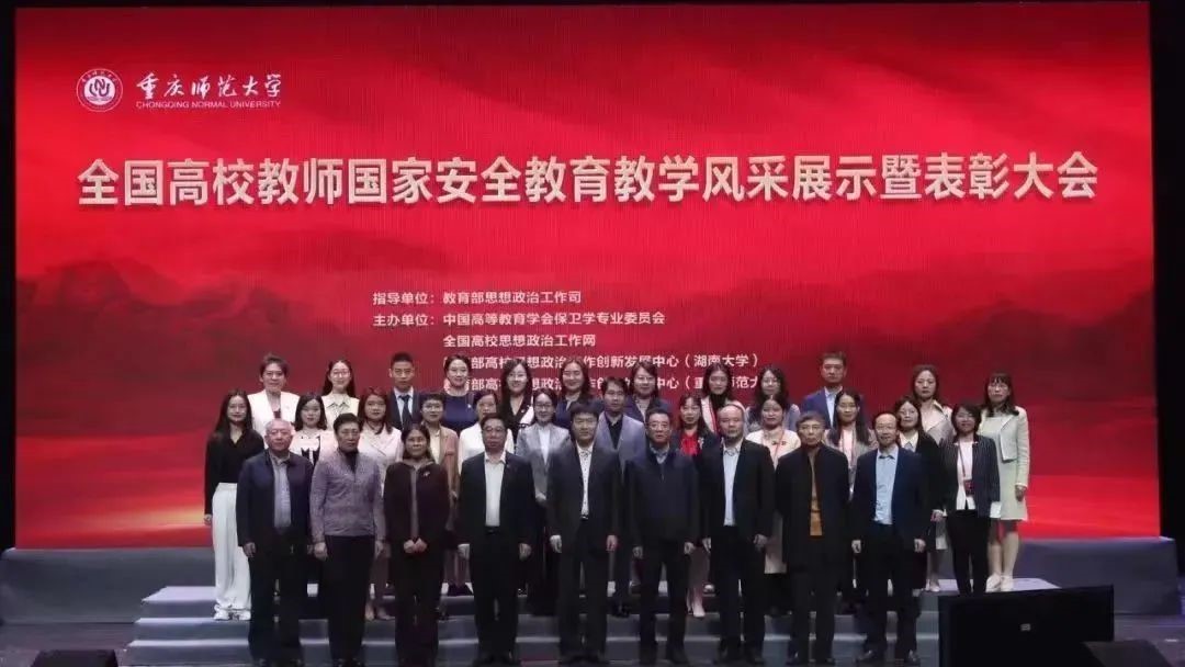 为深入学习宣传贯彻党的二十大精神,贯彻落实总体国家安全观,进一步增强高校教师国家安全素养和教学技能,4月6日至8日,全国高校国家安全教育教学风采展示暨表彰大会在重庆师范大学举行,教育部思想政治工作司副司长葛元杰,重庆师范大学党委副书记、校长孟东方,重庆师范大学党委副书记陈志军,中国高等教育学会保卫学专业委员会秘书长谭琳,教育部高校思想政治工作创新发展中心主任龚燕等领导出席。我院党委副书记王觊婧获邀参与现场展示,并荣获全国总决赛闪亮风采教师奖。