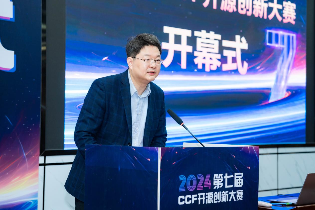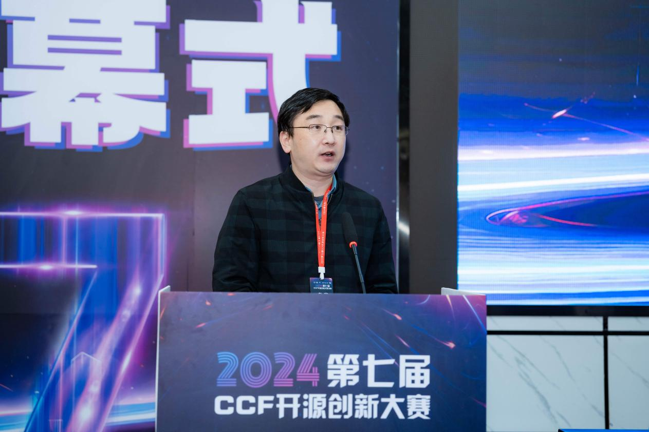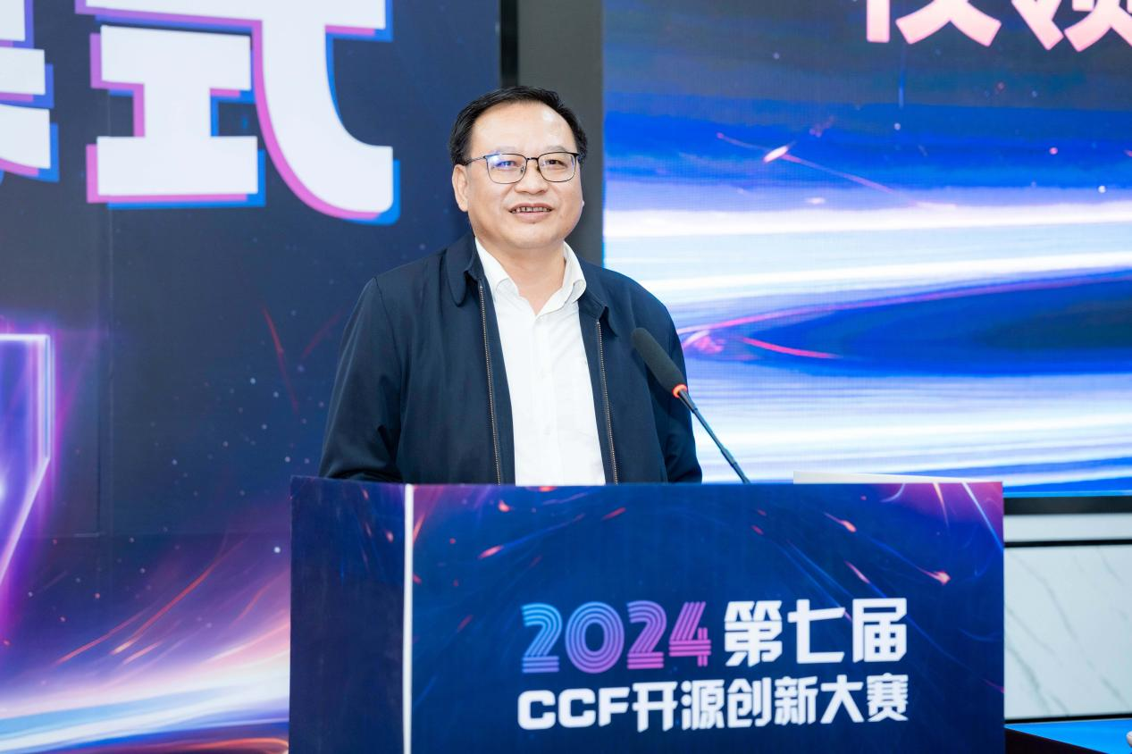 第七届CCF开源创新大赛组织委员会主席、湖南先进技术研究院可控开源创新中心主任水超作为组委会领导代表发言。他对赛事指导委员会等各方的策划和组织表示感谢,对本次大赛入围选手表示祝贺,最后表达了对入围决赛选手精彩表现的期待,期待同学们持续关注开源、参与开源,做出更多优秀开源成果,为国家开源生态建设做出更多贡献。
