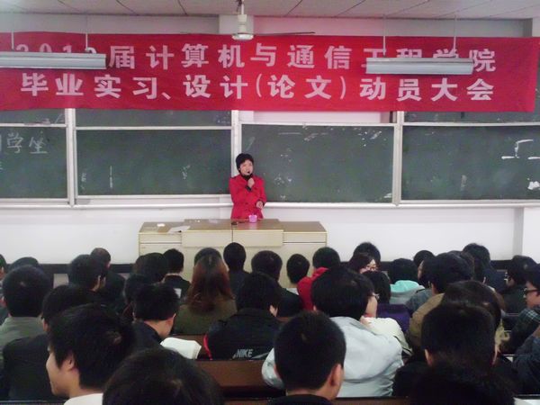 为推动我院2012届毕业设计、毕业实习工作,提高专业人才培养的质量,计算机与通信工程学院于11月18日下午14:00在金盆岭12教300教室隆重举行2012届毕业设计(论文)、毕业实习动员大会,会议由教务办主任毛云芳老师主持。我院主管教学工作的龙敏副院长、网络教研室易建勋老师、教务办杨雪芹老师、学工办邵巧艳老师出席大会,本部2012届全体毕业生及城南学生代表参加本次会议。