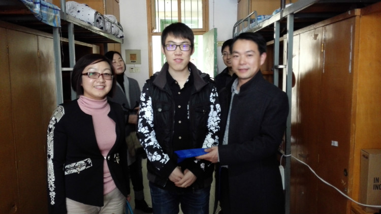 学院领导在得知本院软件工程专业2012级本科生曹宝轩同学生病后,学院党委书记方琼、副书记王任飞、副院长王威等院领导、老师和中新软件教育集团老总陈龙一行第一时间前往曹宝轩同学所在宿舍,对其看望慰问。