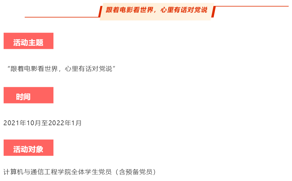 此次活动面向计通学院全体学生党员(含预备党员),活动流程如下:每周一由“计通先锋”公众号推送3-5部对党员同志具有教育意义的优质电影。各支部负责人对推荐的电影组织观影活动,各支部学生党员每两周至少就一部优秀电影或反思或领会写影评。由实践部对影评进行初步评审,筛选出优质影评,最后在“计通先锋”公众号发起优质影评线上投票,支持率较高者将获评“优质影评”。活动末期将在线下进行优质影评分享会并给优质影评人颁发荣誉证书,同时优质影评人进行电影分享与影评心得分享。