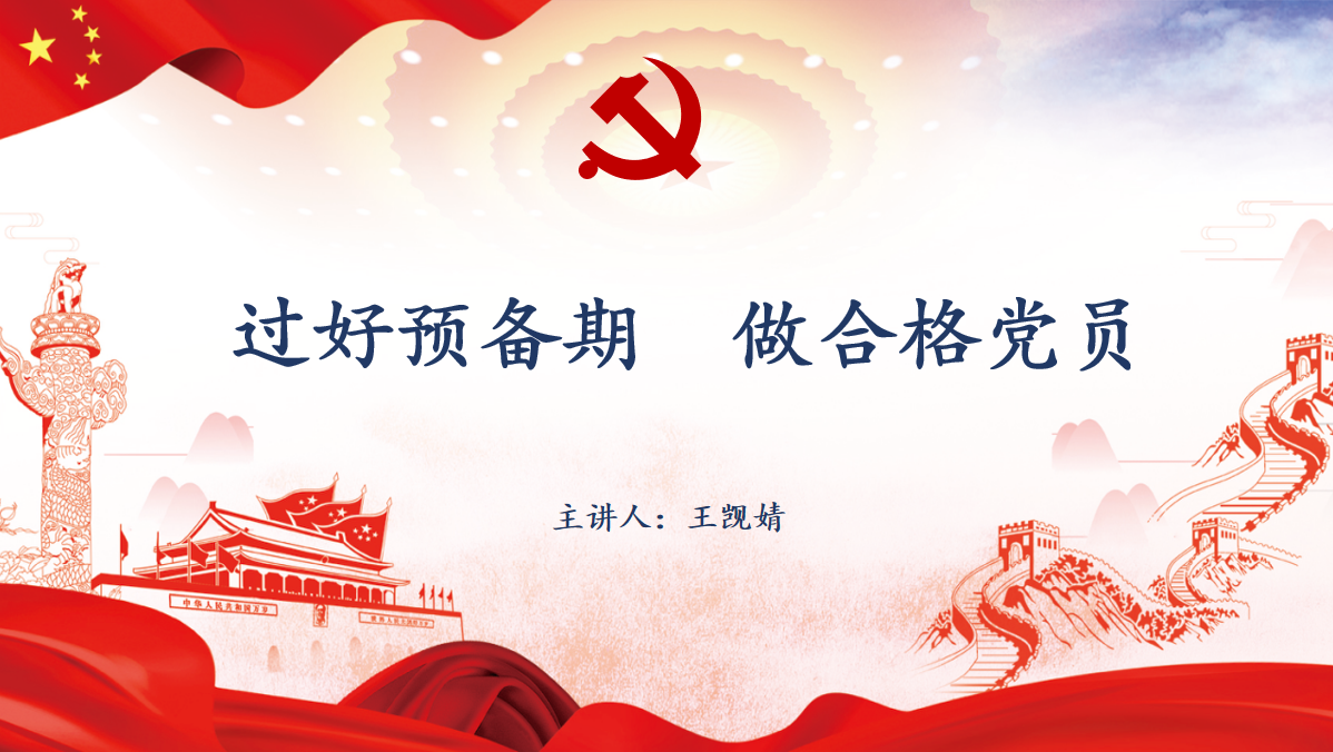 王觊婧的主讲内容是关于如何过好预备期做合格党员的若干准则,她分别从接收新党员预备期、注意问题、转正程序以及党员的教育管理四个部分介绍了关于成为一名合格党员的若干准则,向同学们强调要学习贯彻习近平新时代中国特色社会主义思想,加强政治理论教育、突出政治教育和政治训练、强化党章党规党纪教育、加强党的宗旨教育、进行革命传统教育、开展形势政策教育、注重知识技能教育完成党员教育基本任务。