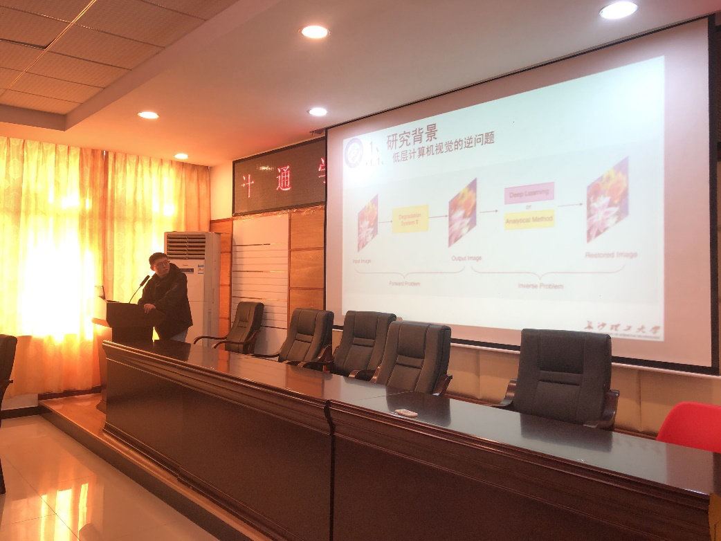 首先是伍悠同学主讲的“基于相关滤波和特征融合的目标跟踪算法” 研究。 伍悠同学从目标跟踪的应用角度切入,提出目标跟踪当前存在的难点—遮挡、光线、动态性以及相似性。结合多特征和动态学习等方法,伍悠同学提出了一种快速目标跟踪器,能够有效提高目标跟踪的效果。接下来是赵淑珍同学主讲的关于“超分辨率处理的多源遥感图像融合”研究。赵淑珍同学通过诙谐的图片,先向在座同学讲述了什么是超分辨率。赵淑珍同学讲到,多源遥感图像融合相比于单源,能表现出更多的特征,对场景的描述更加准确,有助于定位识别和后期分类。最后是由李捷同学主讲“基于低秩张量补全的图像修复”研究。李捷同学讲到,低层计算机视觉的问题是逆向的,因为这些问题要求根据从三维到二维变换后的输出来进行重构。考虑到逆问题往往是不适定的,李捷同学结合低秩张量来修复图像,能够很好的刻画图像高维数据中复杂的本质结构,利用已知的数据元素恢复丢失的元素。