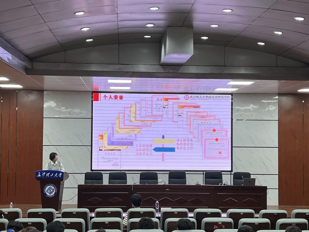 水利学院杨恩喆以“探路者”、“坚守者”和“追梦者”三个方面展开自身的分享。他的科研成果丰厚,实践经历丰富。在学习上,他认为实践出真知;在工作中,他立志把青春奉献在服务同学的沃土上。他的个人相关事迹得到学习强国号、新湖南、云顶国际vip8866官媒的专篇报道;