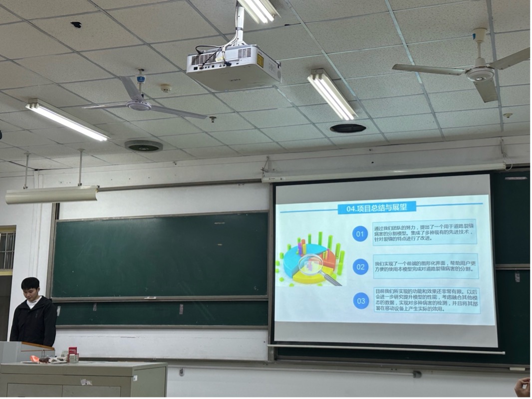 第一位分享经验的同学是曾志高。在分享经验的期间,曾志高为我们提供了一个深入了解比赛的机会。他简洁明了地介绍了比赛的整体框架,其中包括理论创新、技术创新和应用创新三个赛道。随后特别强调了他们团队在比赛中呈现的杰出作品:“基于高低频注意力的道路病害双流分割系统”,这一技术创新作品成功脱颖而出,彰显了团队在技术创新方面的卓越能力。值得一提的是,该项目已获得三项专利,进一步证明了其在创新领域的引领地位。我们从他比赛答辩的经验分享得知,在八分钟的答辩时间内,突出呈现项目的创新和方法是至关重要的。在该过程中需要精炼、聚焦,将更多时间用于详细展示项目的创新之处,以更迅速、更准确地为评委呈现团队创新项目的独特魅力,才能在众多竞争团队中脱颖而出。
