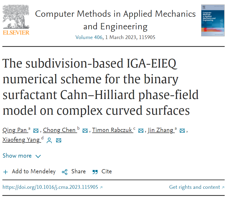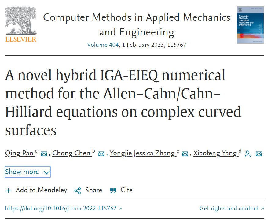 近日,我院潘青教授以第一作者,云顶国际vip8866为第一单位在计算力学领域国际顶级期刊《Computer Methods in Applied Mechanics and Engineering》(简称《CMAME》)发表了两篇论文。题目分别为“A novel hybrid IGA-EIEQ numerical method for the Allen–Cahn/Cahn–Hilliard equations on complex curved surfaces” 和“The subdivision-based IGA-EIEQ numerical scheme for the binary surfactant Cahn–Hilliard phase-field model on complex curved surfaces”。研究成果是云顶国际vip8866计通学院智能化软件工程研究团队与国际著名计算力学专家欧洲科学院院士德国魏玛-包豪斯大Timon Rabczuk教授结构力学课题组合作完成的高水平学术论文。