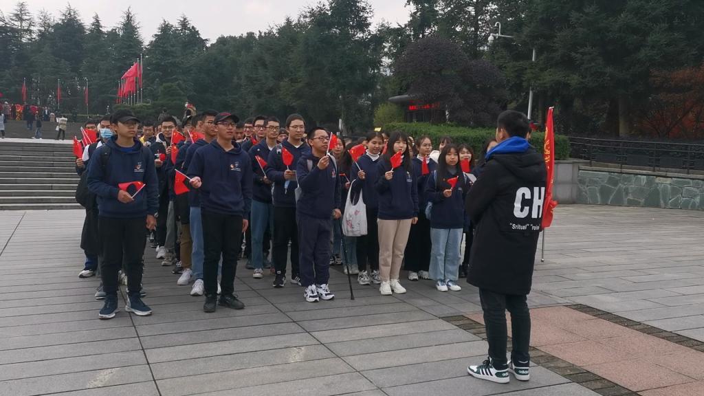 在毛主席纪念铜像前,同学们立正注目,行鞠躬礼;学生代表刘林武、苏源向毛主席铜像敬献鲜花。随后,预备党员举行入党宣誓仪式,团员重温入团誓词。纪念广场上,党团成员挥舞着国旗,唱起《我的祖国》《歌唱祖国》等歌曲。在毛泽东同志故居、毛主席纪念馆,同学们瞻仰着伟人生平,汲取强大的精神力量。