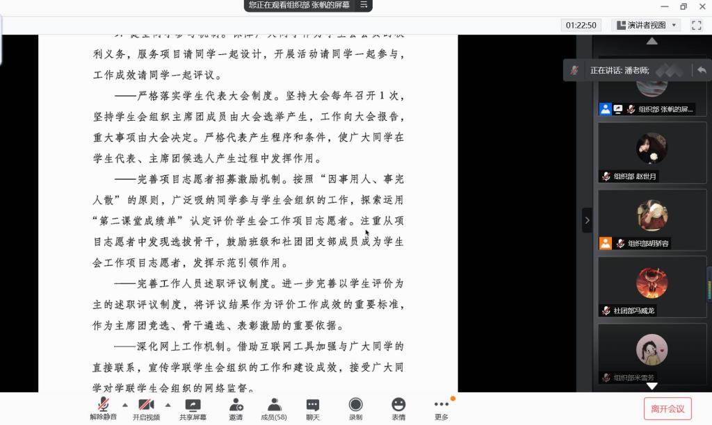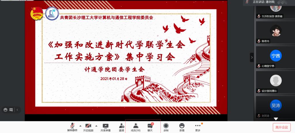 1月28日下午,计通学院团委学生会通过腾讯线上会议召开了《加强和改进新时代学联学生会工作实施方案》集中学习会。院团委书记潘枝花主讲,计通学院团委学生会副部长以上干部参加。