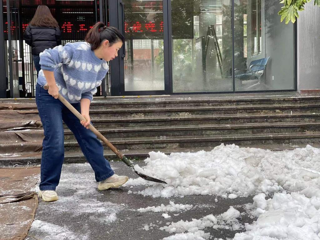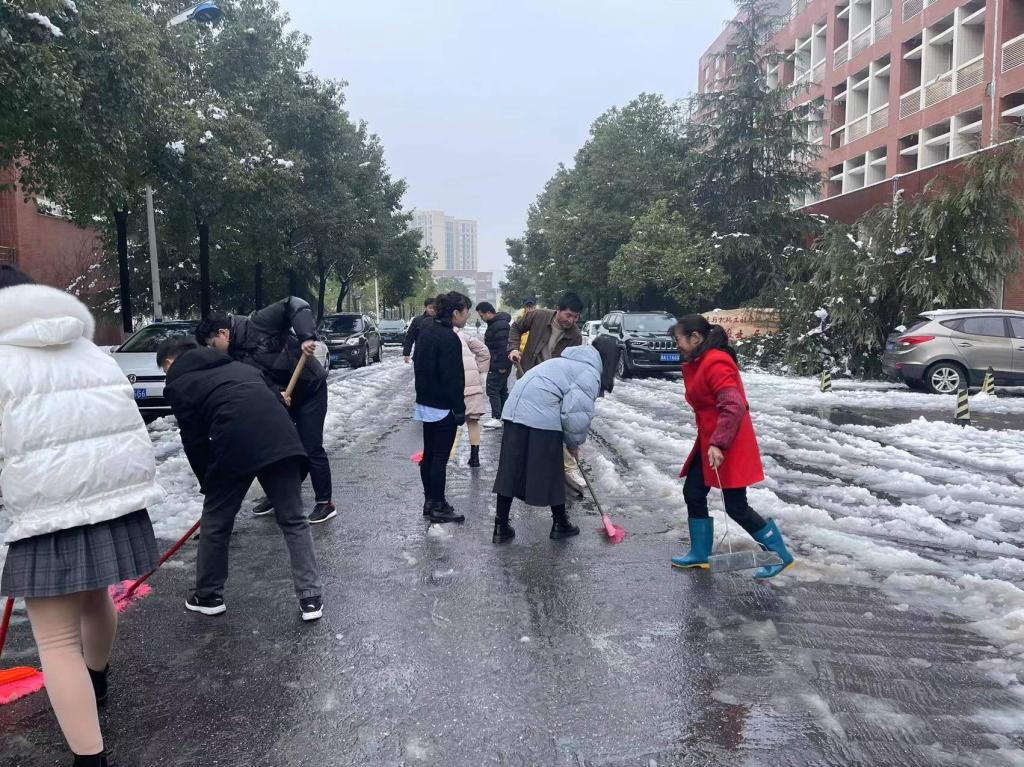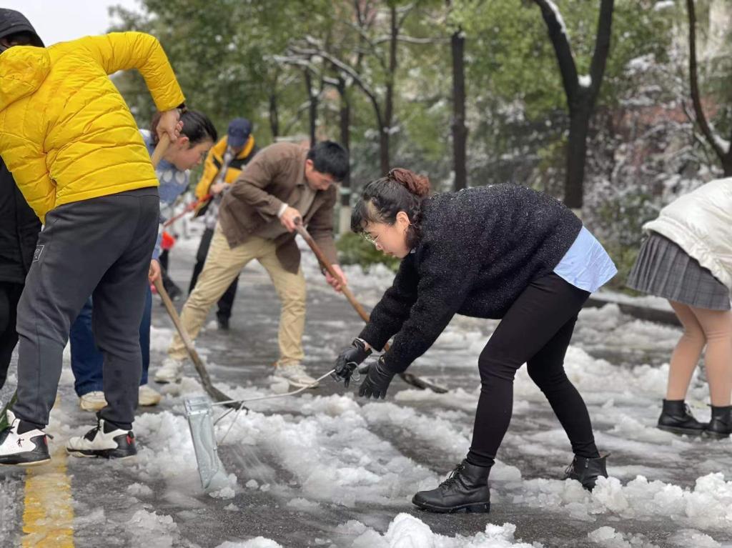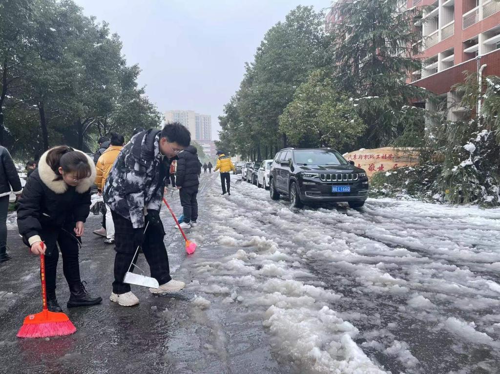 2月22日,受低温天气影响,长沙再次迎来暴雪,校园里也一片北国风光。为了保证大家的出行安全和道路通畅,23日早晨,计通学院组织了“清雪护行,情暖人心”志愿服务,扫雪除冰,在辅导员易亭亭老师、聂静老师的带领下,20级研究生党支部全体党员冲锋在前、志愿在前、服务在前,扫雪除冰,积极应对雨雪冰冻天气,为保证行人车辆安全贡献自己的一份力量。