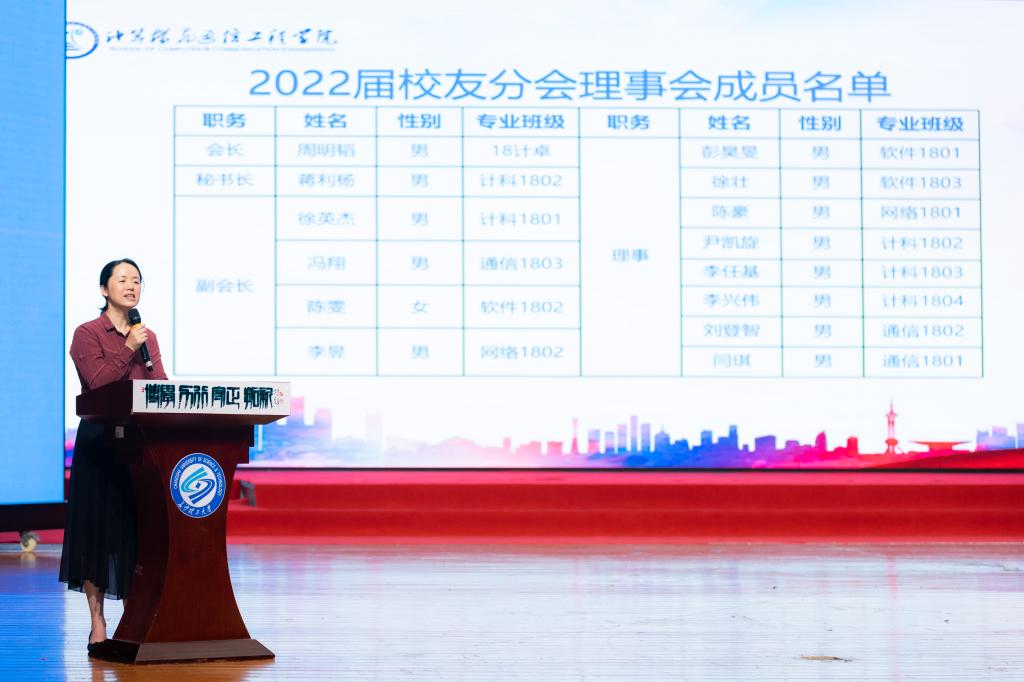会议伊始,会场播放了“时光记忆”暖场视频,播放同学们在云顶国际vip8866的青春岁月。随后,王静琦致辞,介绍了学校校友广大的覆盖面以及深厚的情感联系,表达了对学院校友分会的温暖祝福与美好祝愿。孔伟红《宣读计通学院2022届校友分会成立通知》,并表达了对分会蓬勃发展的期许和对全体毕业生的温暖祝福。紧接着进行了授旗仪式及出征宣誓,校友分会全体联络员上台接旗,王静琦进行授旗,分会秘书蒋利杨带领全体同学进行宣誓。校友分会会长周明韬发言,他发出两点倡议,一是铭记学校文化,秉承学院精神,不断提升自我;二是加强与校友会的沟通与联系,为母校的发展献计献策。张锦宣读了《计算机与通信工程学院关于表彰周明韬等优秀毕业生的通报》文件,随后大会为获得毕业生先进个人的优秀同学颁奖,全体领导老师上台为毕业学生送上了祝福。会议最后进行毕业教育,郑国义着重强调了安全问题。