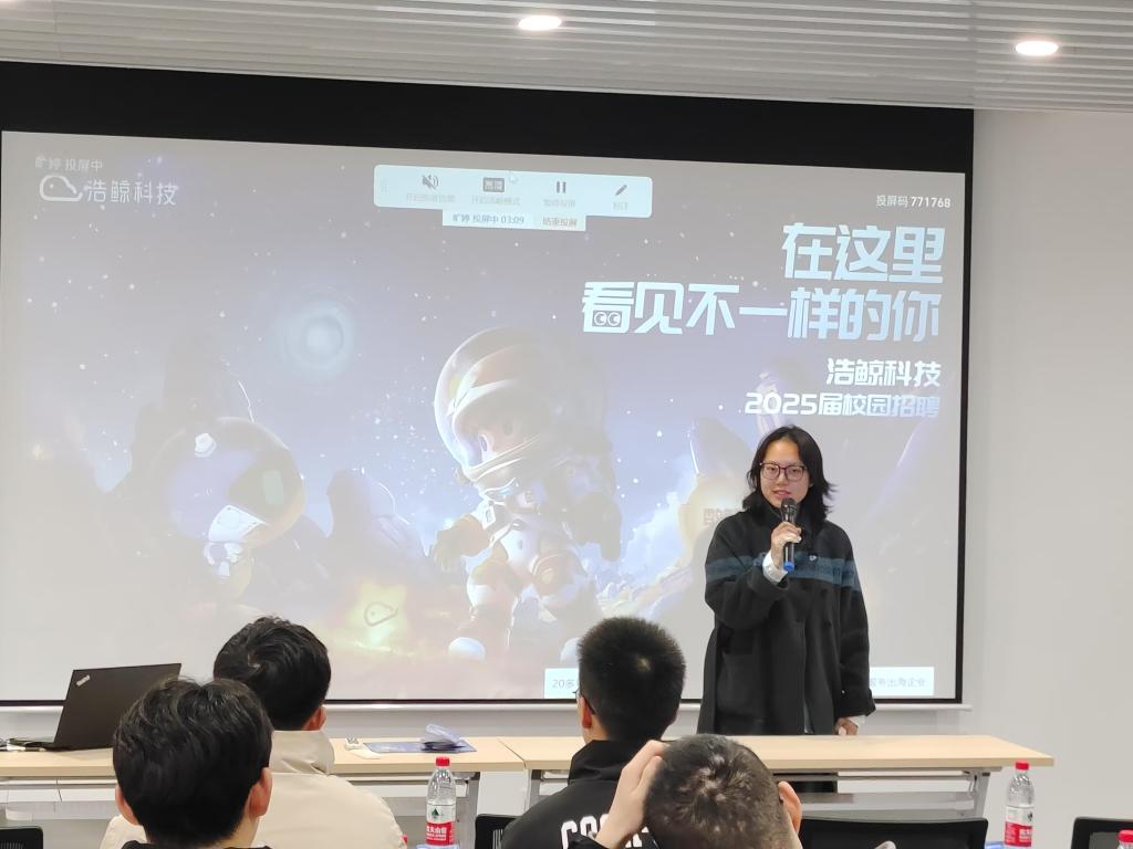 在介绍环节中,两位来自计算机学院的校友来到现场,为现场学弟学妹们分享自己在浩鲸科技的工作与生活经历。两位校友目前在技术研发部门任职,她们回忆起初入公司时的情形,首次参与第一个大型项目困难重重,在团队成员的共同努力下,通过不断查阅资料、反复测试,最终成功攻克难关。她感慨地说:“在这里,每一次解决问题都是一次成长,团队的协作精神让我迅速融入工作。”